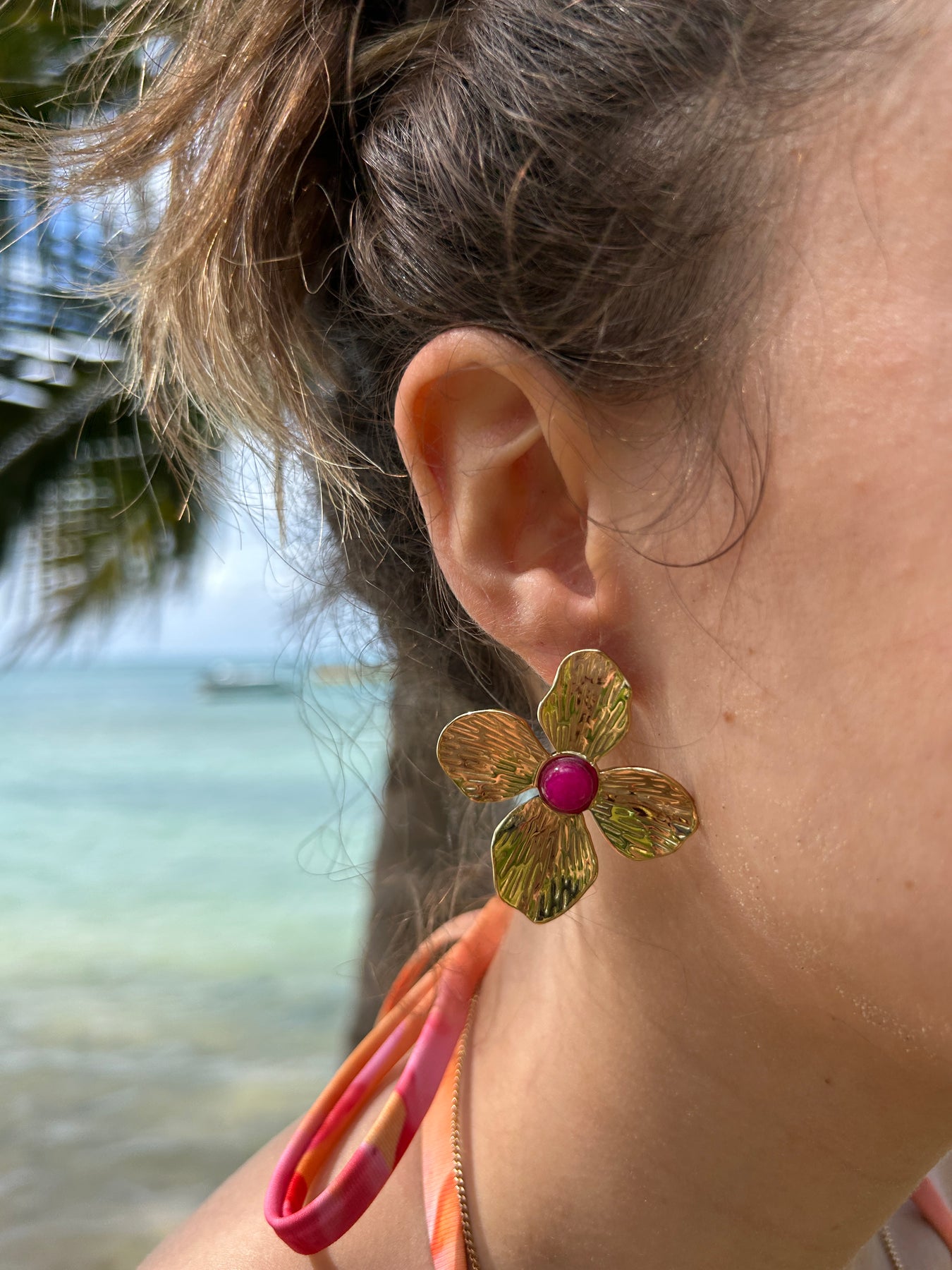 Boucles d'oreilles fleurs dorées et pierre rose